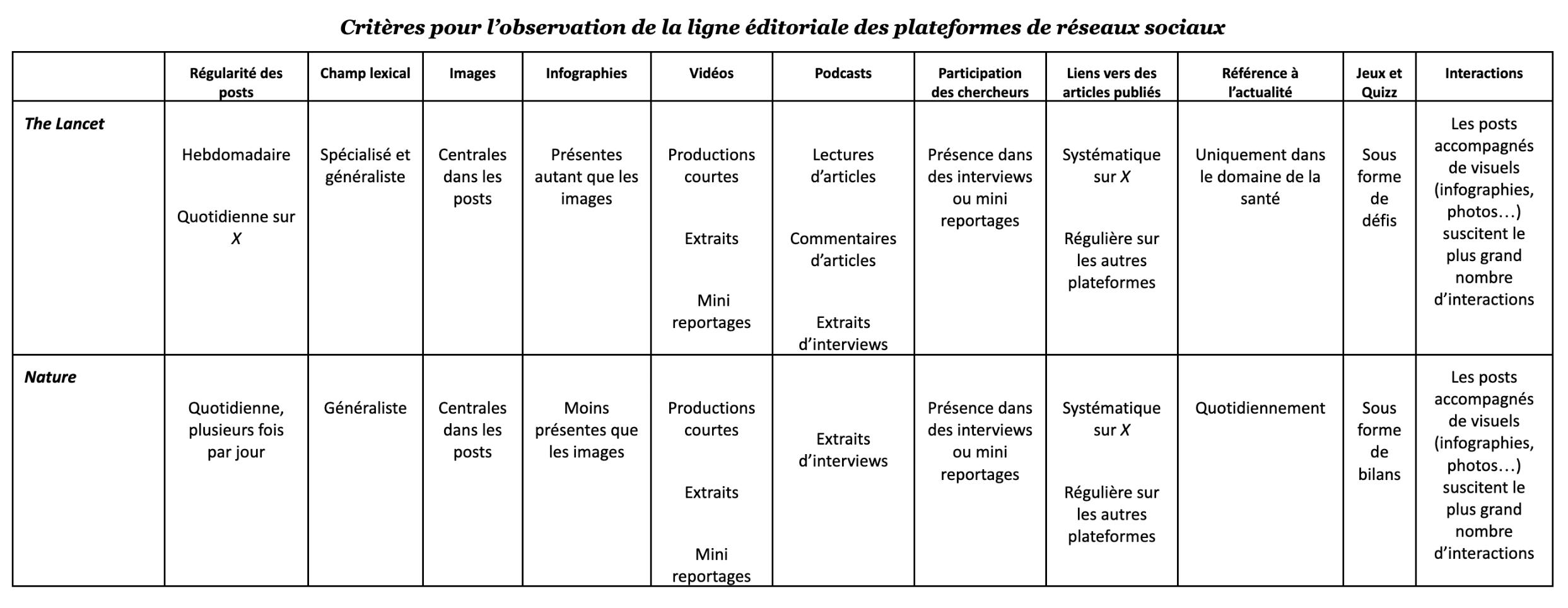 Pour observer de quelle manière les Publishers historiques transposent leurs luttes du champ de la communication scientifique vers celui de la communication des sciences, il est pertinent d’investir leurs activités déployées sur les comptes de réseaux sociaux de leurs revues scientifiques. Il s’agit ici d’observer de quelle manière ils développent à grands frais, sur les comptes de ces revues, une ligne éditoriale adaptée à une audience hétérogène, plus large que celle des chercheurs ou des lecteurs des revues en question. Pour ce faire, nous avons observé et analysé sur une période de 5 mois (janvier – mai 2024), les contenus diffusés sur les comptes de réseaux sociaux de deux acteurs majeurs de la publication scientifique dans le domaine des sciences et de la santé, respectivement Nature (du groupe Nature) et The Lancet (du groupe Lancet d’Elsevier).