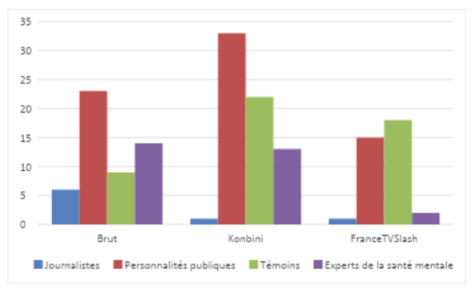 Alors que les professionnels en santé mentale sont très nombreux sur Konbini et encore plus sur Brut, ils sont moins visibles sur FranceTVSlash. Par ailleurs, alors que l’on aurait pu s’attendre à une certaine perméabilité des experts entre les différents comptes étudiés, on remarque que ce n’est pas le cas à une exception près : le psychiatre Jean-Victor Blanc (~4900 abonnés), fondateur du Festival Culture Pop et Psy (~14 000 abonnés), dont ont été partenaires Konbini et Brut. Leur rôle dans ces médias est cadré autour du conseil et de la description d’éléments d’ordre clinique propres à la santé mentale. Mais leurs modes d’intervention renseignent sur la position qu’ils occupent dans ces médias. Ils ne répondent pas le plus souvent à des questions dans le cadre d’une interview mais adoptent un positionnement de médiateur, s’adressant directement au public derrière son écran.