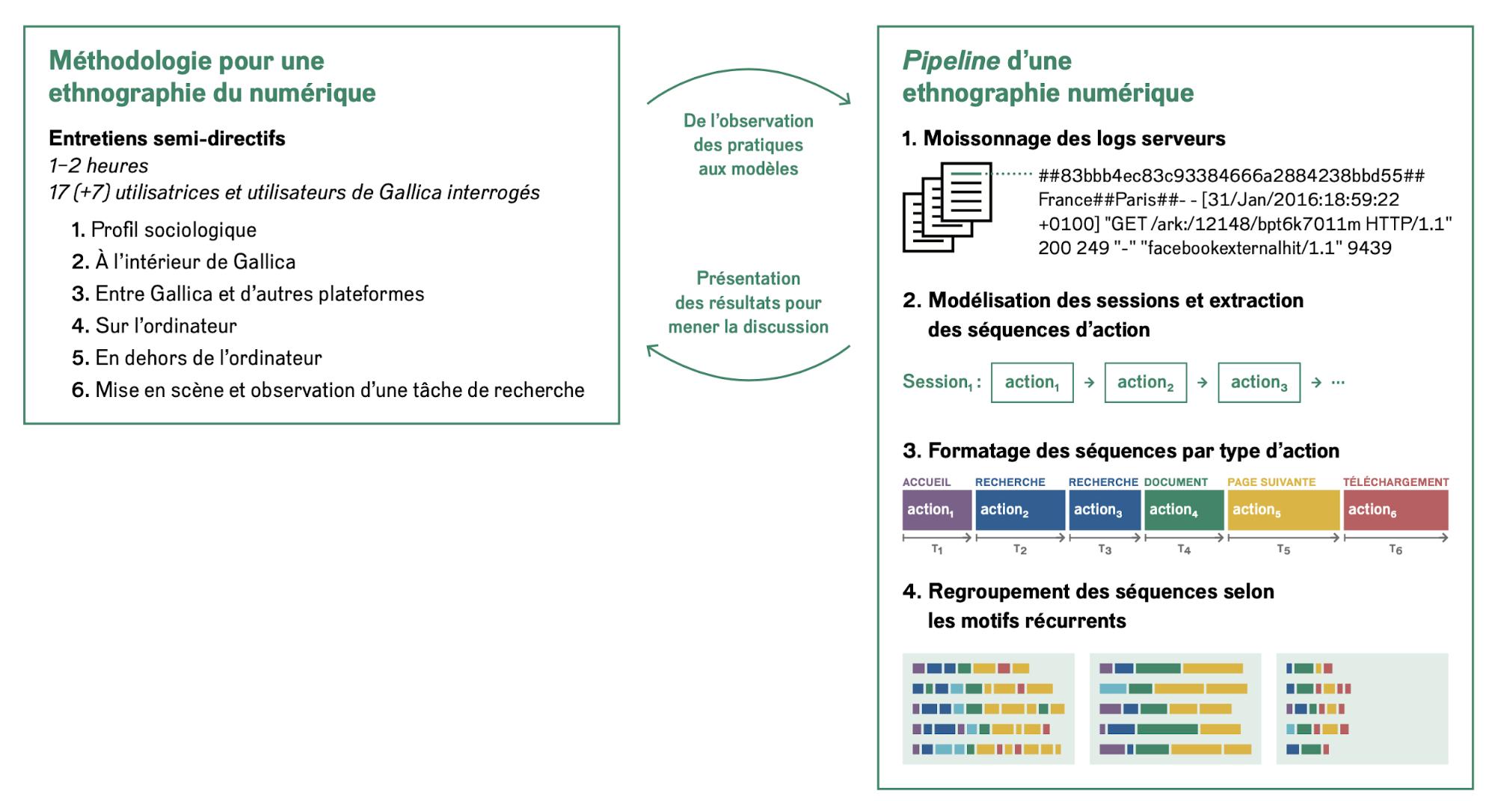 Les deux versants, qualitatif et quantitatif, sont mis en relation : les entretiens sont utilisés pour modéliser les parcours usagers dans les logs – ex. des seuils de fréquence d’actions permettent de filtrer les robots – ainsi que pour les interpréter – ex. les métaphores des usagers permettent de qualifier les régimes idéaux-typiques – ; réciproquement, les visualisations produites par l’analyse de logs – qu’il s’agisse de représentations de parcours types ou de cartographies du corpus – peuvent être présentées comme support de discussion lors de l’entretien.