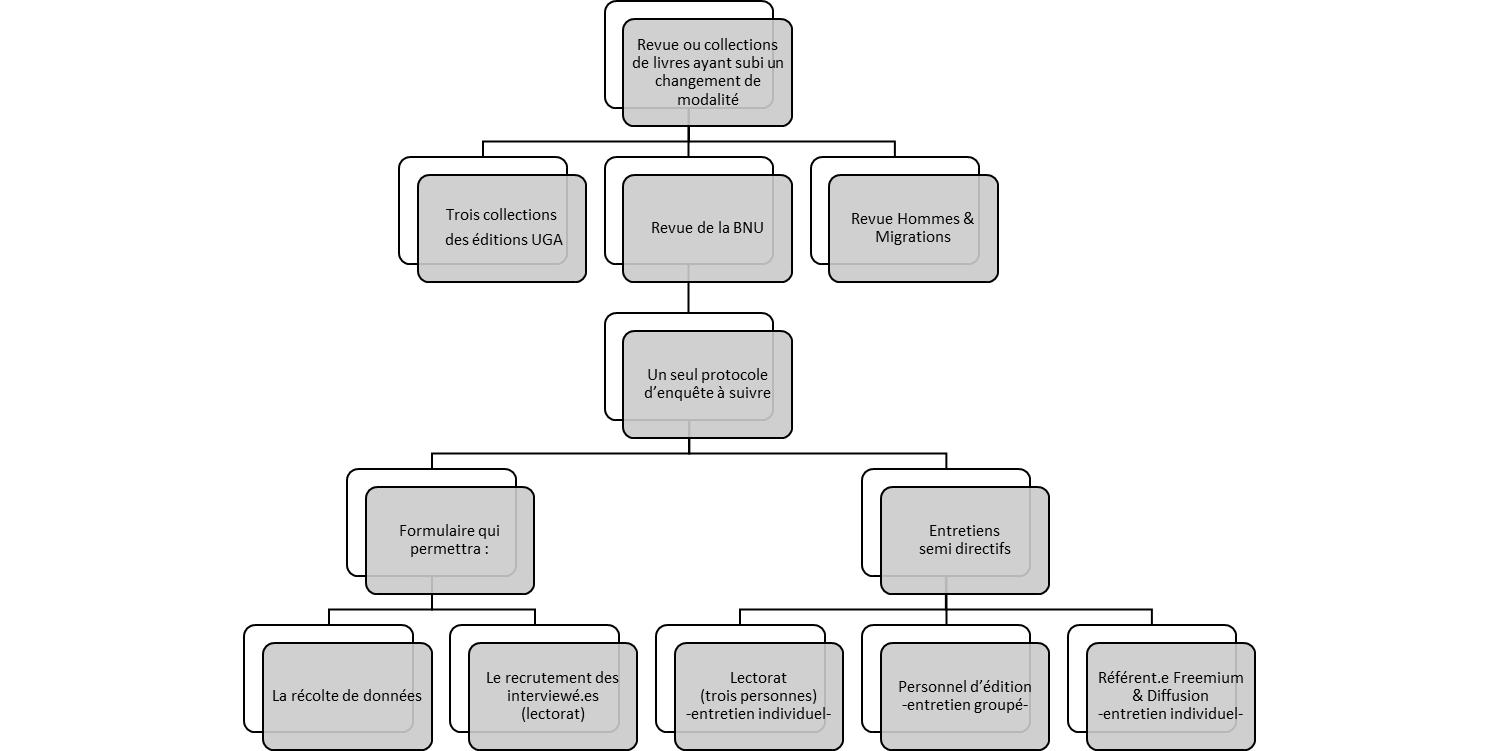 Le périmètre du second terrain est circonscrit par le consortium COMMONS, visant à fédérer les trois infrastructures OpenEdition, Métopes et Huma-Num dans un environnement intégré et interopérable. COMMONS a mis en place un « Observatoire des usages », au sein duquel une étude sur les pratiques et sur les usages a été élaborée. Le terrain dont nous tirons nos observations pour cet article correspond à une enquête exploratoire : il s’agit de deux revues et d’une collection de livres ayant fait l’objet d’un changement de modalité d’accès sur les plateformes OpenEdition Journals et OpenEdition Books.