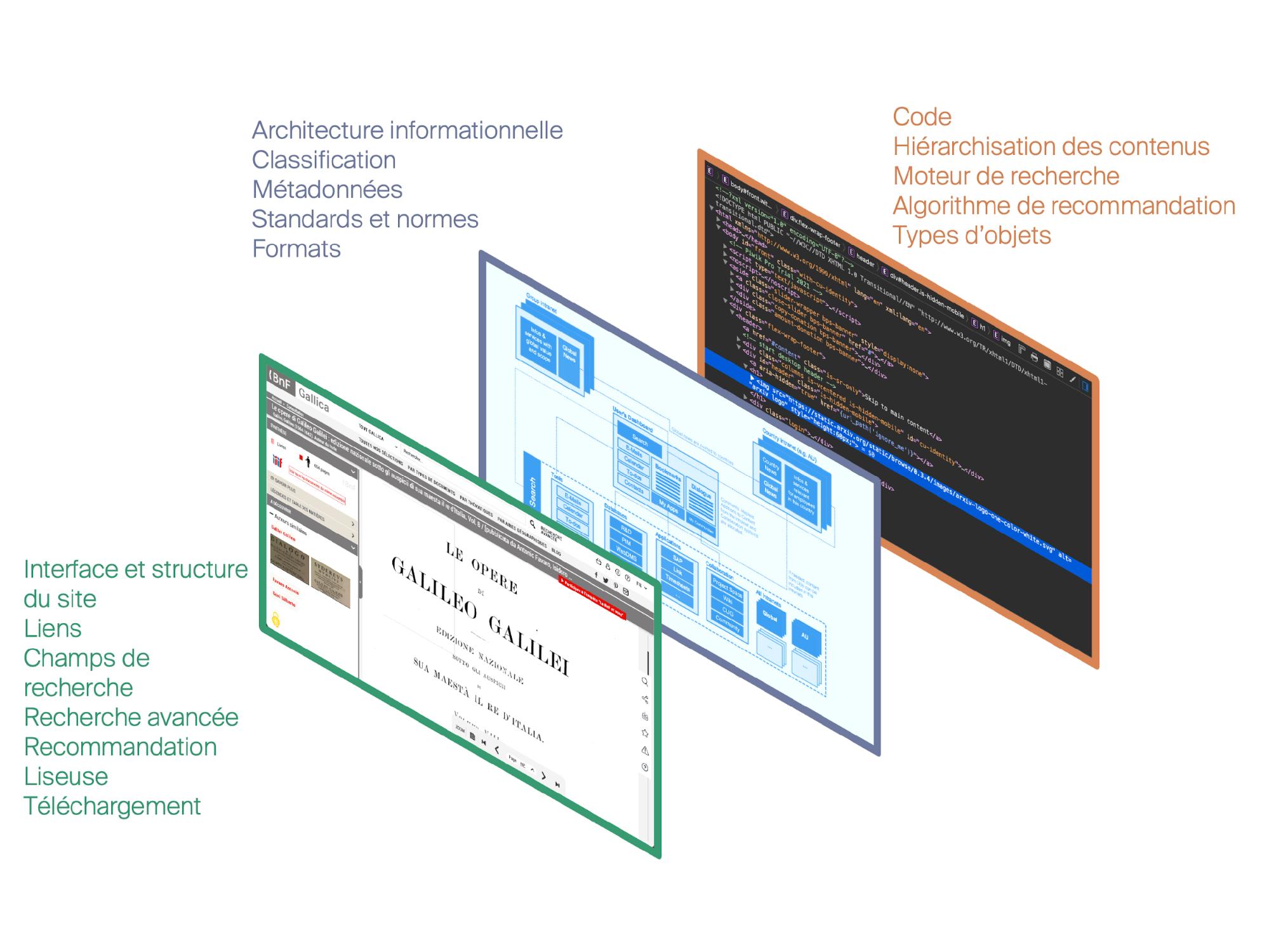 Le second pôle vise à analyser les objets socio-techniques que sont ces plateformes comme des environnements numériques dont la sémiotique – sédimentée sur trois niveaux (voir illus. 4) – est la condition de possibilité des pratiques déployées par les usagers.