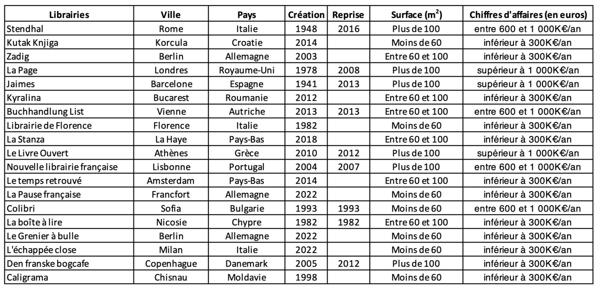 Le premier élément notable est la grande variété de situations de ces librairies, qui vont de la petite structure située sur l’île de Korčula en Croatie (45 m2), avec un chiffre d’affaires inférieur à 300 K€ par an, à des établissements de taille plus importante situés dans de grandes capitales comme La Page à Londres, La Nouvelle librairie française à Lisbonne, Le Livre ouvert à Athènes ou Zadig à Berlin, avec un chiffre d’affaires annuel avoisinant le million d’euros.