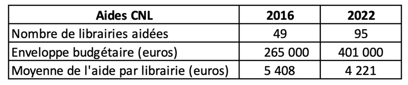Alors que le montant des enveloppes 5 consacrées aux LFE par le CNL est de 265 K€ répartis entre 49 librairies en 2016, celui-ci a fortement progressé en 2022, au moment du Covid (Tableau 2). Même en augmentation, ces aides doivent être relativisées dans la mesure où elles ne représentent que 8 % du montant total alloué aux librairies par le CNL et qu’elles portent sur l’ensemble des librairies francophones dans le monde. À noter également que le montant moyen des aides par établissement est en baisse, le nombre de bénéficiaires ayant sensiblement progressé.